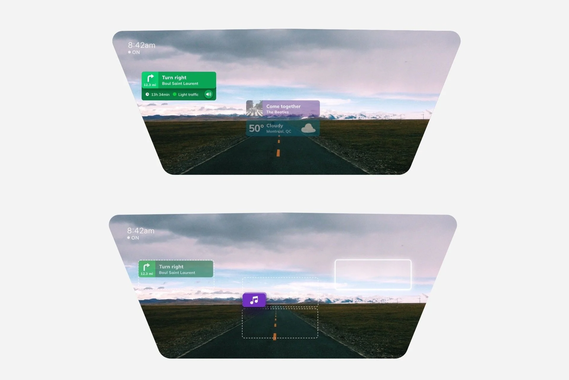 Proof-of-concept for a heads-up display projected onto the windshield of a semi-autonomous vehicle. System combines speech recognition, gesture recognition, eye-tracking and a visual interface. It first debuted at CES in Las Vegas on January 11, 2020.